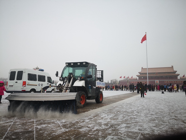 北京環衛集團工作人員在天安門廣場進行除雪作業。(央廣網發 溫瑩瑩攝)