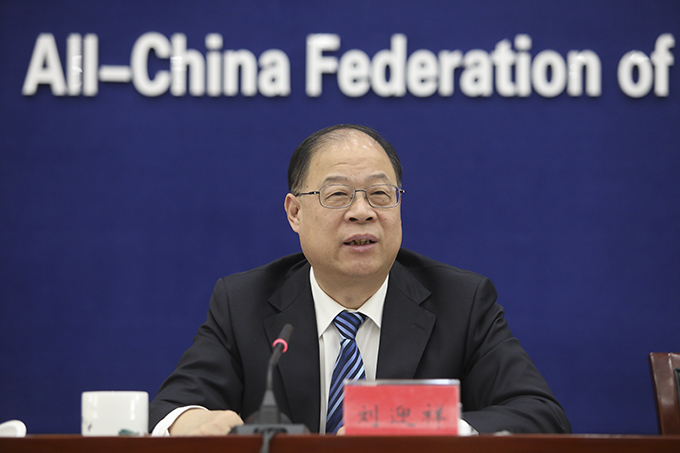 全總新聞發言人、宣教部部長劉迎祥通報有關情況。圖片來源:中華全國總工會網站