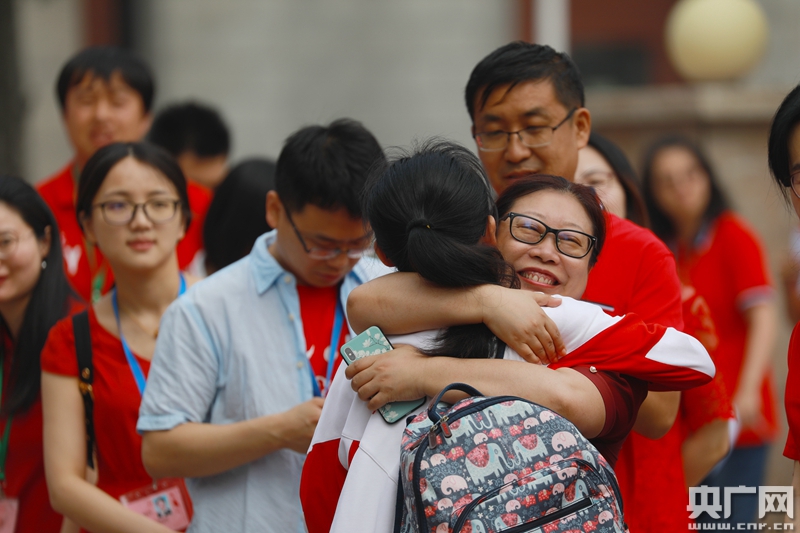 人大附中考生在進考場之前和老師擁抱(央廣網記者 張凱航 攝)