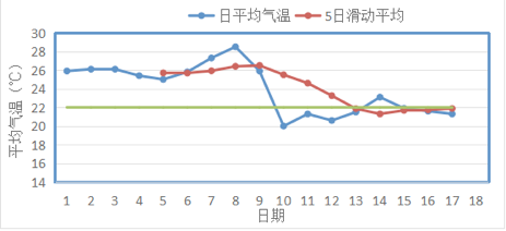 由上圖可見,2019年自9月13日起滑動平均氣溫序列開始小于22℃,并于9月17日達(dá)到連續(xù)5天小于22℃,其所對應(yīng)的氣溫序列中第一個小于22℃的日期為9月10日(20.0℃),而常年入秋日期為9月9日,因此無需進(jìn)行二次判斷,據(jù)此可判斷2019年入秋日期為9月10日。