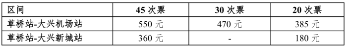 電子計次票主要包括:草橋站至大興機場站區段,45次票550元、30次票470元、20次票385元三種;草橋站至大興新城站區段,45次票360元、20次票180元兩種。乘客可結合自身出行的區間及次數需求,選擇購買相應的區間、次數的電子計次票。