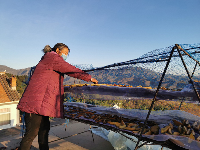 深秋時節,承德夜間氣溫已經達到零下。在新杖子鎮的山頂,61歲的張淑琴在房頂晾曬紅薯干。她是“大筐隊”里面的老人了,從十六七歲開始,張淑琴就摘酸棗、種水果乘火車到城里去賣錢補貼家用。