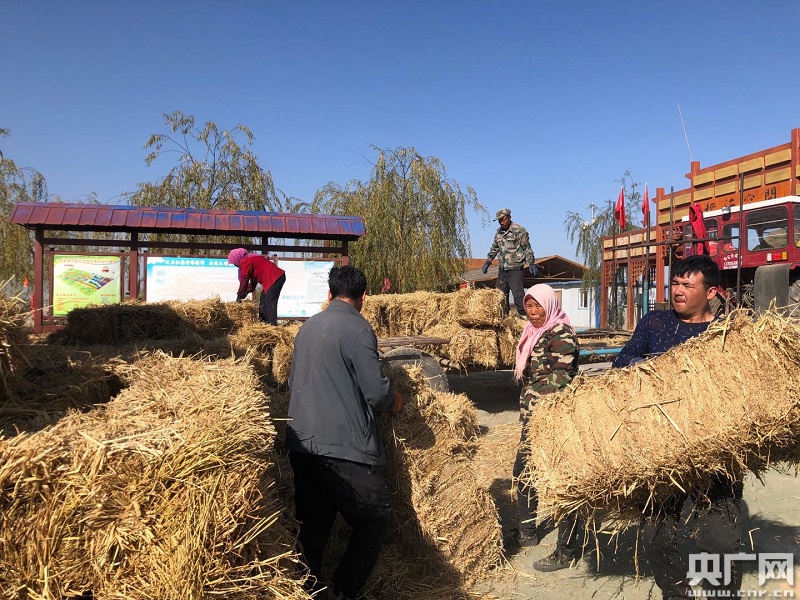 11月1日,寧夏賀蘭縣,當(dāng)?shù)剞r(nóng)民正在忙著收稻秸。(央廣網(wǎng)記者 王晶 攝)