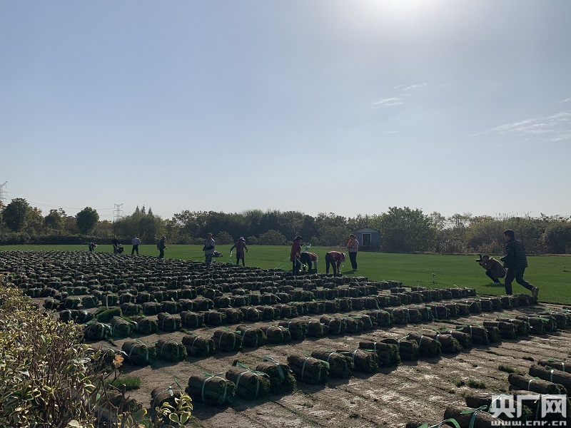 村民正在對(duì)草皮進(jìn)行捆扎(央廣網(wǎng)記者 孫冰潔 攝)