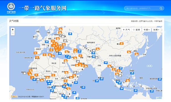 1月1日,“一帶一路”氣象服務網正式上線,圖為北京時間1月2日上午11時實時天氣預報(圖片來源:官網截圖)