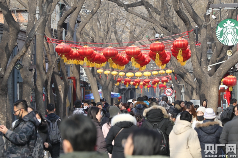 北京南鑼鼓巷游客如織,高高掛起的紅燈籠增添節(jié)日氣氛(央廣網(wǎng)記者 韓靖 攝)