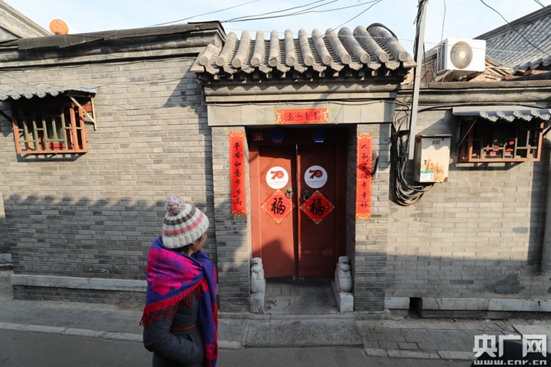在前井胡同,市民在門(mén)上貼了福字和春聯(lián)(央廣網(wǎng)記者 韓靖 攝)