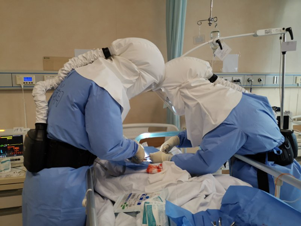 經過與負責ICU的北京協和醫院援助湖北團隊會診,3月2日,張心浩與同事龍小博為劉英實施了氣管切開手術。