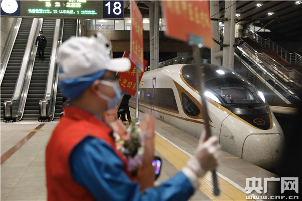 隨著G68次列車平穩開進北京西站,北京迎回第一支從武漢凱旋的醫療隊(央廣網記者 張凱航 攝)