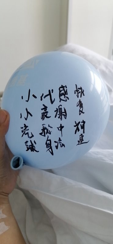 劉成在氣球上寫下“小小氣球,代表我身,感謝中法(同濟醫院中法新城院區),恢復神速”的打油詩來提振信心。(受訪者供圖)