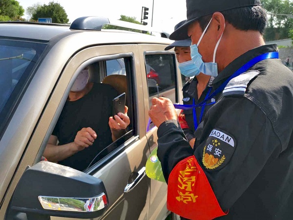 北京市石景山區老山街道強化疫情防控,社區保安檢查車輛內人員安全碼(央廣網發 北京市石景山區老山街道供圖)