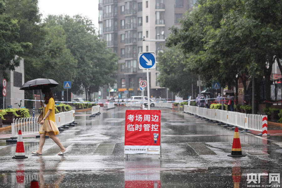 7月9日,北京廣渠門中學考點,工作人員冒雨維持考場周邊秩序(央廣網記者 韓靖 攝)