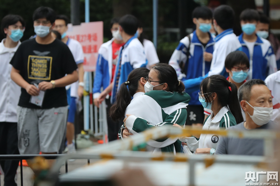 7月10日,北京中關村中學考點,兩名考生走出考場后擁抱(央廣網記者 韓靖 攝)