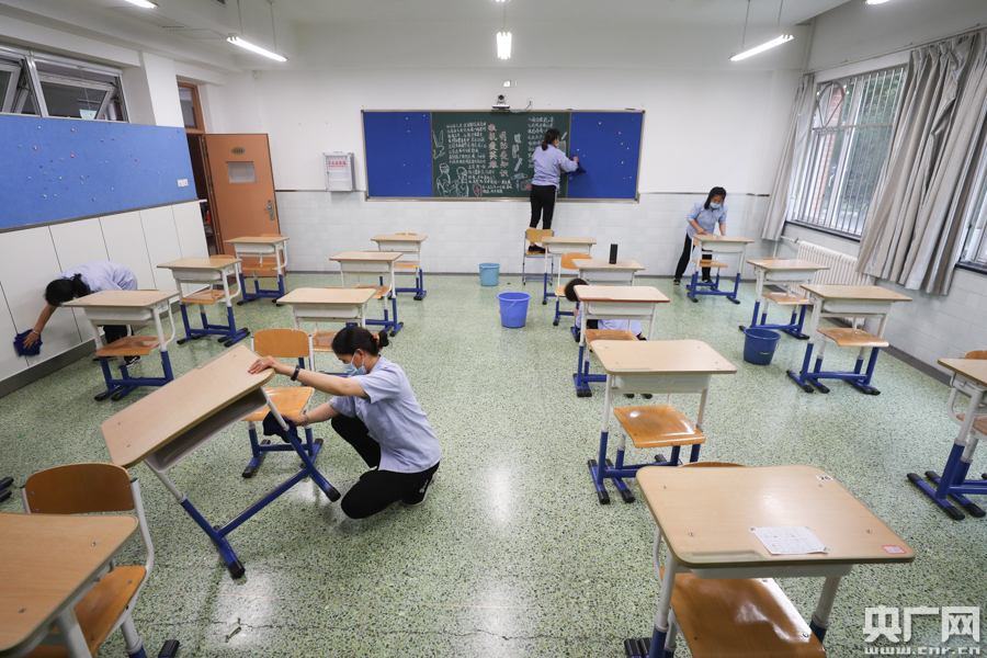 7月3日,北京十二中工作人員正在對考場進行保潔和消毒(央廣網記者 韓靖 攝)