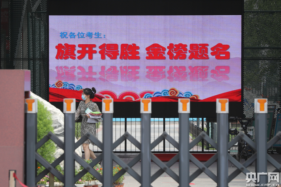 7月4日,北京市通州區運河中學考點,校內電子屏幕上打出對考生的祝福語(央廣網記者 韓靖 攝)