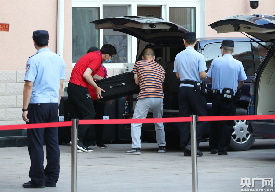 7月7日5時40分,北京市海淀區招生教育和考試中心,各考點校工作人員乘坐專用車輛前來領取考卷(央廣網記者 韓靖 攝)