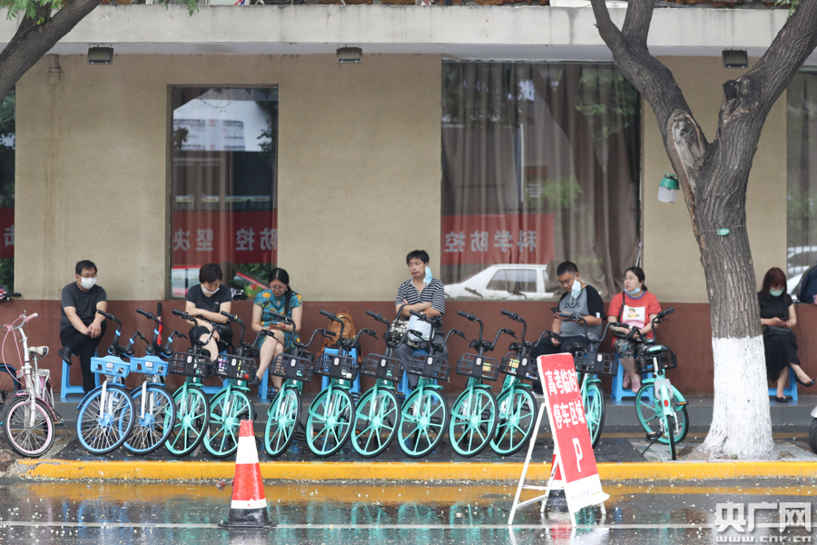 7月9日,北京廣渠門中學考點,前來送考生的家長在路邊避雨(央廣網記者 韓靖 攝)