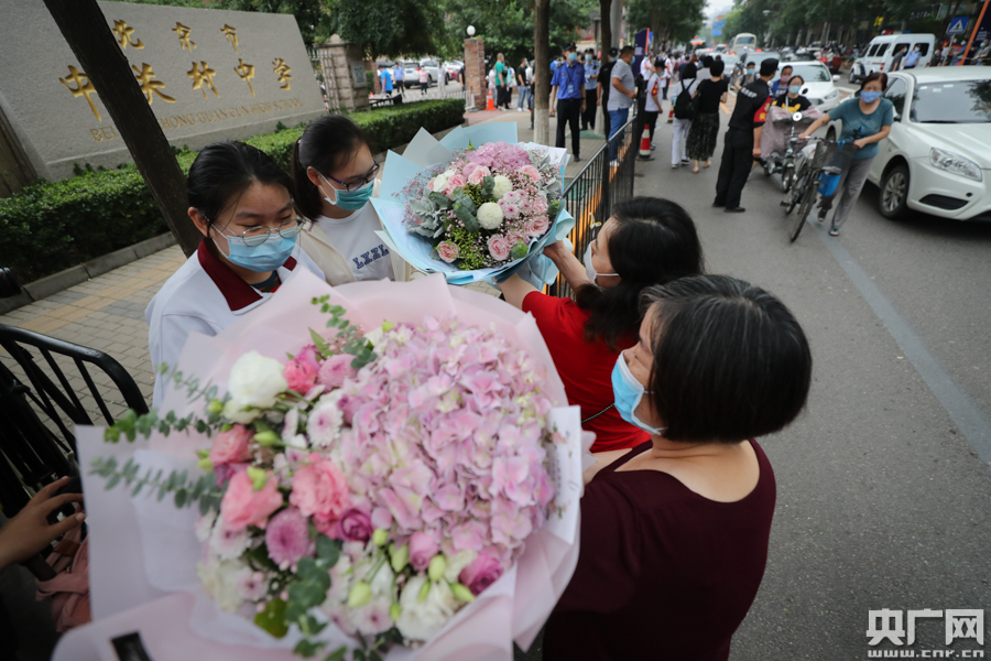 7月10日,北京中關村中學考點,高考結束后兩位家長向考生獻花(央廣網記者 韓靖 攝)