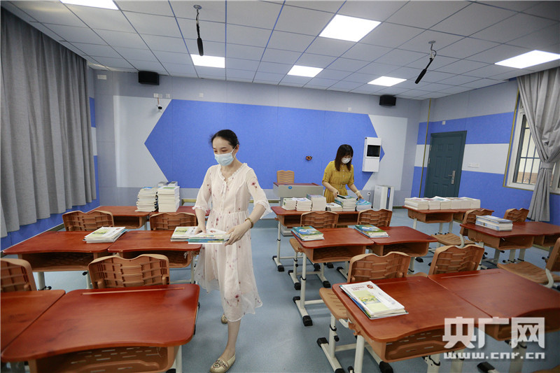 湖北省武漢市楚才中學5G云教室內,老師正在分發新學期課本(央廣網發 王方攝)