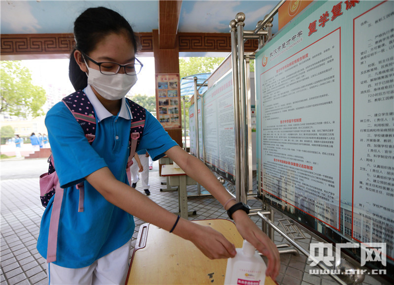 湖北省武漢市楚才中學,一名七年級學生正在進行進入教室前的消毒(央廣網發 王方攝)