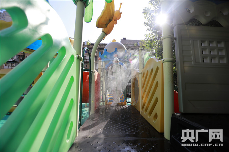 湖北省武漢市華中師范大學附屬鐵橋幼兒園內,消防員正在對室外公共區域進行全面消殺(央廣網發 王方攝)