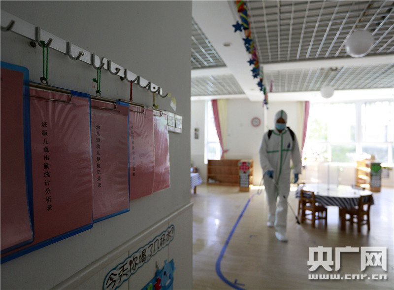 湖北省武漢市華中師范大學附屬鐵橋幼兒園內,消防員正在對班級教室進行全面消殺(央廣網發 王方攝)