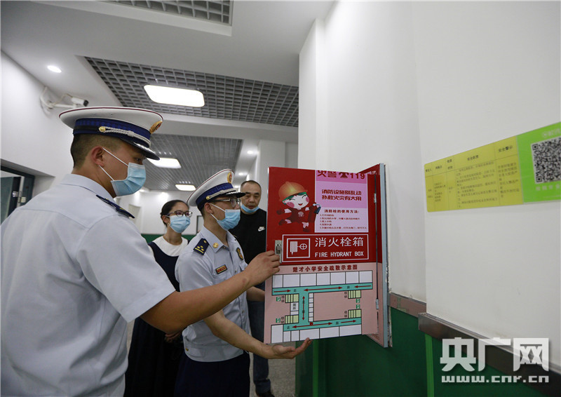湖北省武漢市漢陽區楚才小學,兩名消防監督員正在檢查室內消防設施設備是否完好有效(央廣網發 王方攝)