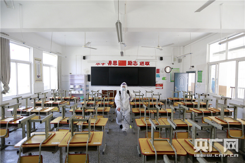湖北省武漢市楚才中學七年級教室內,學校工作人員正在進行消殺作業(央廣網發 王方攝)