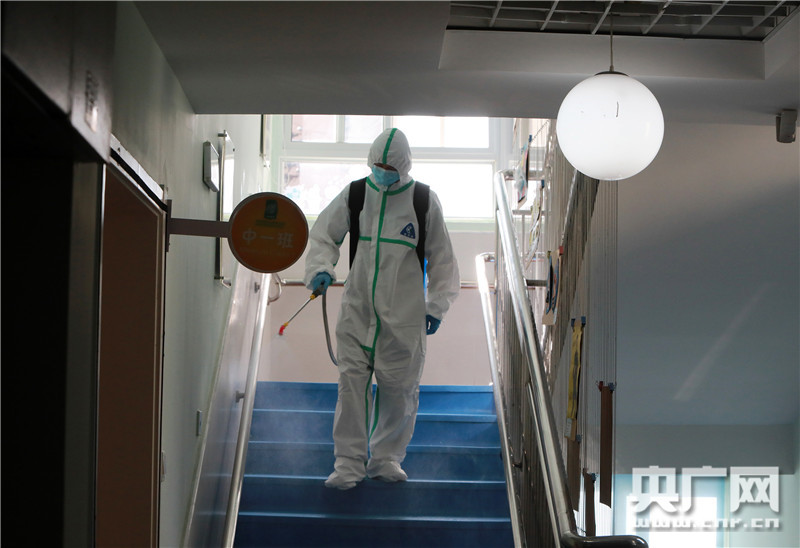 湖北省武漢市華中師范大學附屬鐵橋幼兒園內,消防員正在對樓梯區域進行全面消殺(央廣網發王方攝)