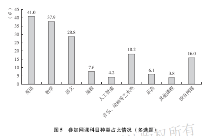 未成年人參加網(wǎng)課科目種類(lèi)占比情況柱狀圖(央廣網(wǎng)發(fā) 社科文獻(xiàn)出版社 供圖)
