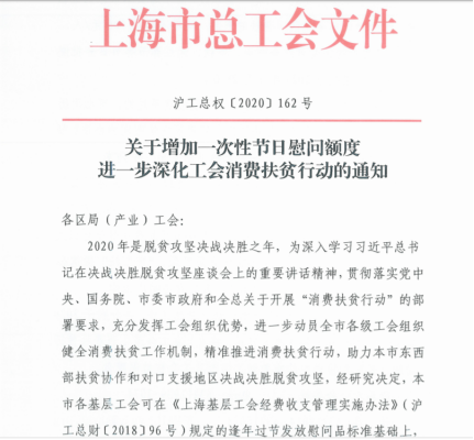 此外,上海市總工會于日前發布《關于增加一次性節日慰問額度進一步深化工會消費扶貧行動的通知》,明確上海市各基層工會可在《上海基層工會經費收支管理實施辦法》定的逢年過節發放慰問品標準基礎上,增加一次性節日慰問額度,用于購買上海市東西部扶貧協作和對口支援地區消費扶貧產品,標準不超過500元/人。