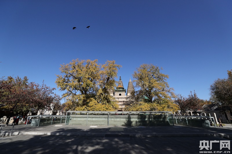 11月3日,五塔寺,園內(nèi)的兩顆古銀杏樹(shù)在藍(lán)天的映襯下格外顯眼(央廣網(wǎng)記者 韓靖 攝)