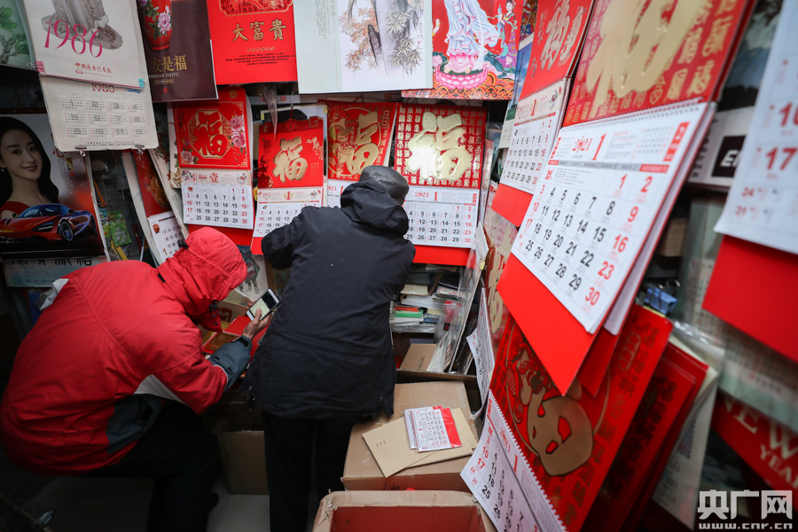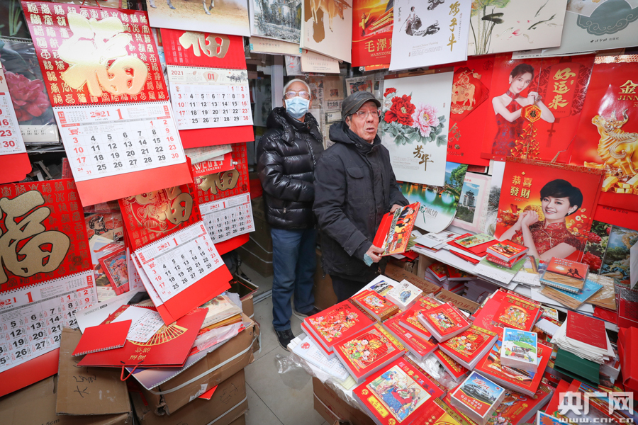 金安光正在幫顧客挑選掛歷(央廣網(wǎng)記者 韓靖攝)