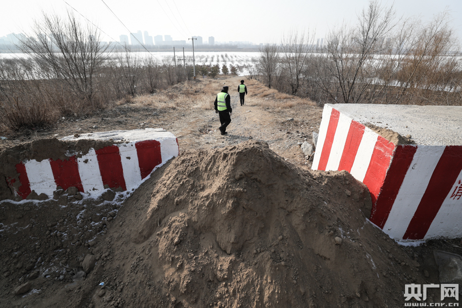 巡防人員正在河堤上執勤,河對岸就是河北省廊坊市(央廣網記者 韓靖 攝)