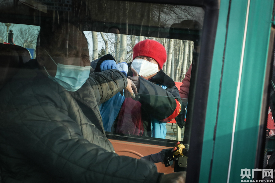 執勤人員正在為進村人員測量體溫(央廣網記者 韓靖 攝)