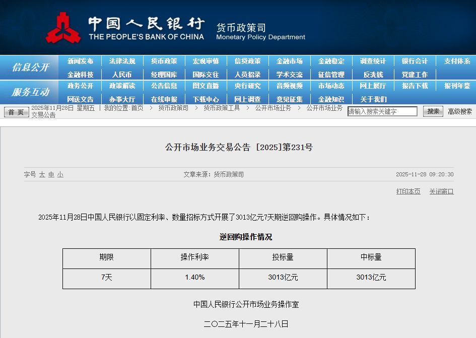 據央行官網消息,2025年11月28日中國人民銀行以固定利率、數量招標方式開展了3013億元7天期逆回購操作。具體情況如下: