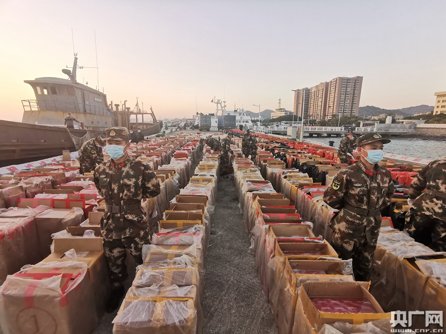 海警執法員正在對現場走私煙草進行清點(央廣網發 通訊員供圖)