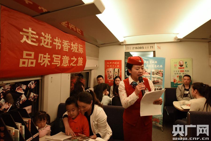 武漢客運段:列車書香分享行進之美 武漢客運段城際動車組車間黨總支書記姜沛介紹,孝感是董永七仙女故事發生地,在孝感這個地方有很多孝順感人的故事,武孝城際開行時,武漢客運段結合這個主題,打造孝文化,開展文化之旅,創建書香列車,提倡旅客在行進中閱讀,品味寫意之旅。 -
