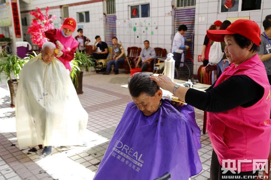 昌吉市綠洲路街道蘇玉琴志愿服務站的志愿者在為老人理發 -