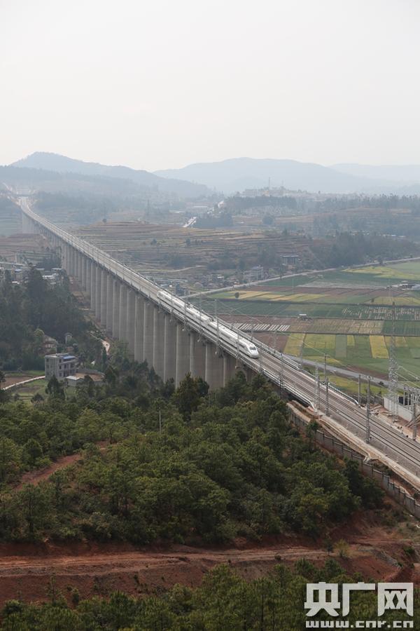 綜合檢測動車飛馳在昆(明)廣(通)大(理)鐵路上。韓富關攝 -