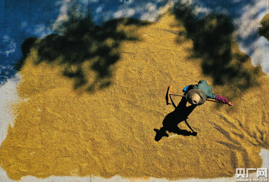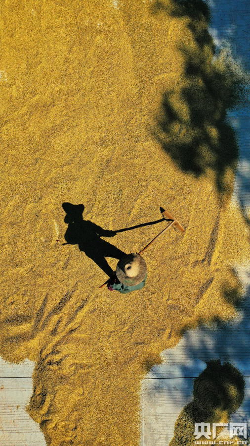 趁著晴好天氣晾曬稻谷(央廣網發 通訊員供圖)