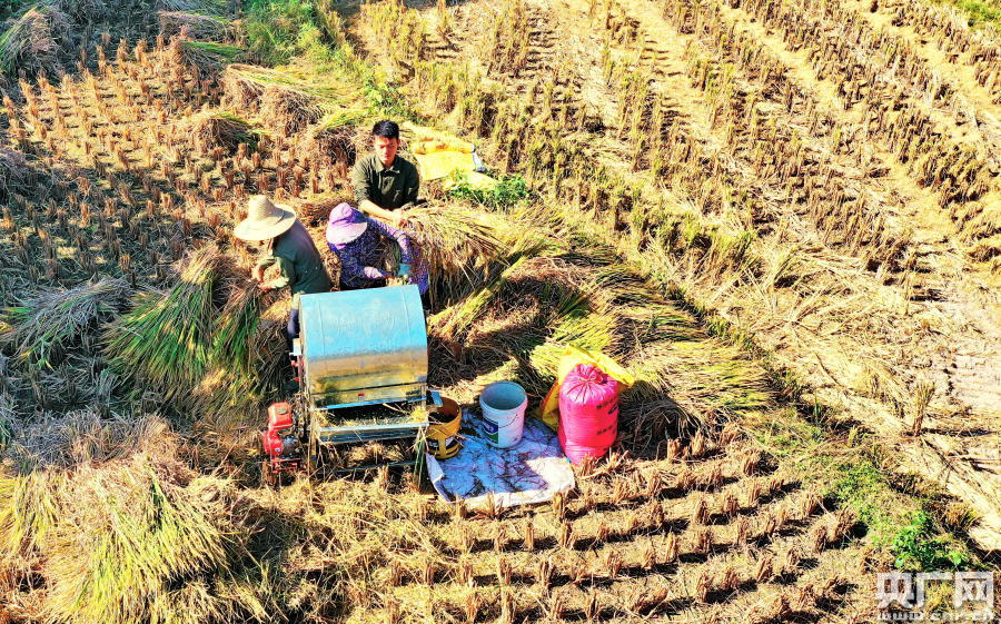村民正在給稻谷脫粒(央廣網發 通訊員供圖)