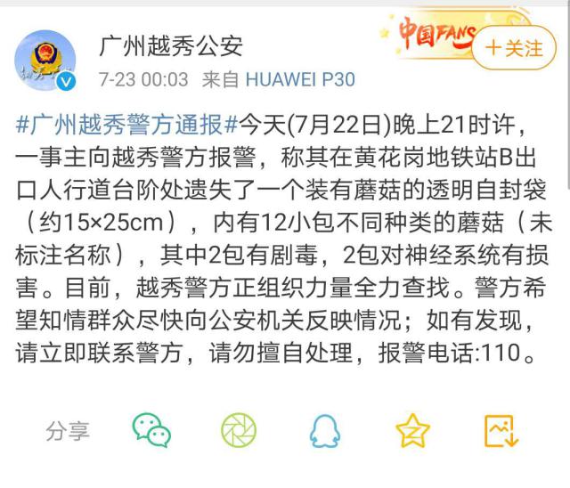 7月22日晚上21時許,一事主向越秀警方報警,稱其在黃花崗地鐵站B出口人行道臺階處遺失了一個裝有蘑菇的透明自封袋(約15×25cm),內有12小包不同種類的蘑菇(未標注名稱),其中2包有劇毒,2包對神經系統有損害。