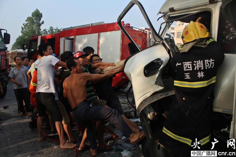 央廣網南寧9月25日消息(記者張壘 許大為 通訊員韋功兵 祝朋飛)今天(25日)7時50分,廣西玉林市博白縣消防中隊接到報警稱:該縣農產品批發市場前發生一起車禍,兩輛貨車相撞,一人受重傷被困。