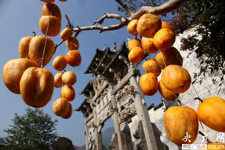 安徽歙縣上豐、許村燈籠柿成熟采摘,農民們將紅透的柿子采摘直接出售,或削皮、晾曬、腌制加工成柿餅提高附加值。燈籠柿促進當地農民增收,為攝影愛好者增設了一道美景。