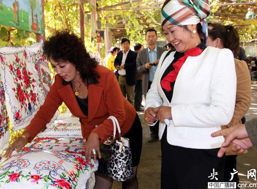新疆庫車縣墩坦闊鎮舉辦農家婦女刺繡作品展(央廣網記者 張雷 攝)