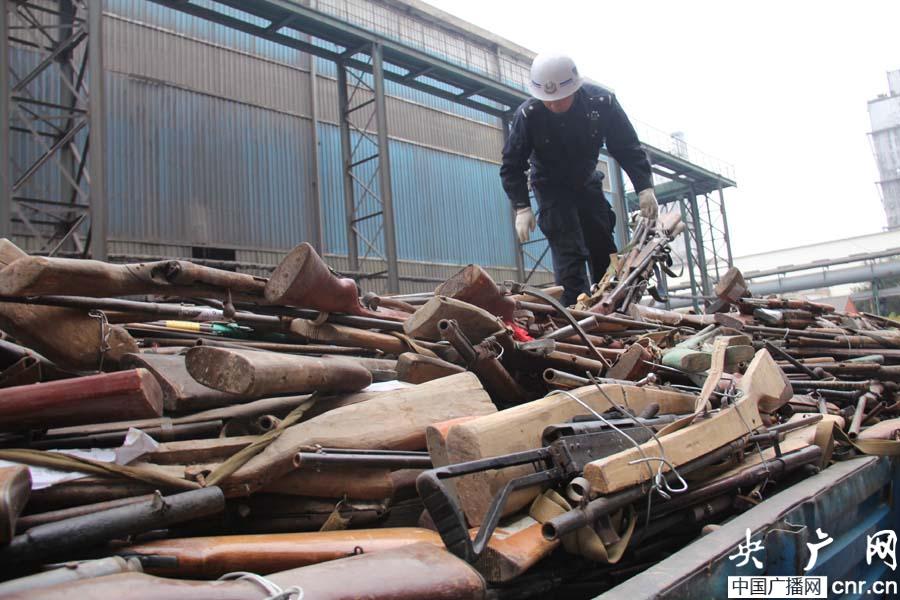 央廣網蘭州10月31日消息(記者焦健 王居蔚)伴隨著煉鋼爐中騰起的一團烈火,爐內的非法槍支已經瞬間化為鐵水。煉鋼廠門口的空地上五輛滿載著非法槍支的大卡車一字排開。車上的一萬余支非法槍支正等待著同樣的命運。今天上午,甘肅省公安廳在蘭州榆中鋼廠對“緝槍治爆”專項行動中收繳的12252支非法制造的火藥槍、獵槍、氣槍,7568支仿真槍、8967把管制刀具予以安全銷毀。