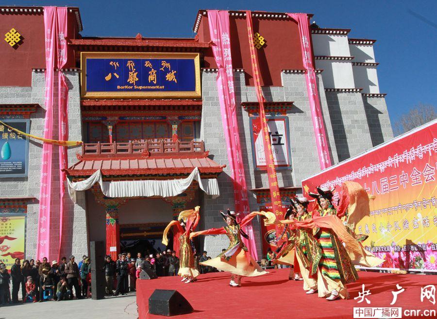 前往八廓商場購物的群眾正在觀看文藝惠民演出(央廣網記者 普布次仁 攝)