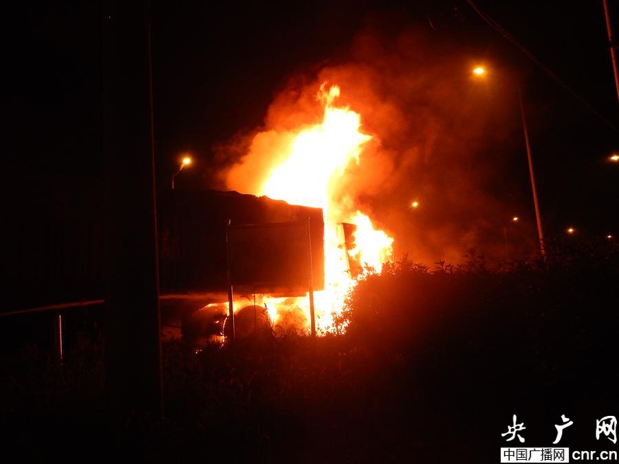 央廣網寧波1月7日消息(記者劉發丁 曹美麗)今天凌晨1點39分,61省道浙江余姚段馬諸加油站前,一輛大型裝煤貨車突然自燃,貨車輪子猛烈燃燒,遠遠看去好像兩個風火輪甚是嚇人。經過消防人員2個多小時的處置,大火終被撲滅。