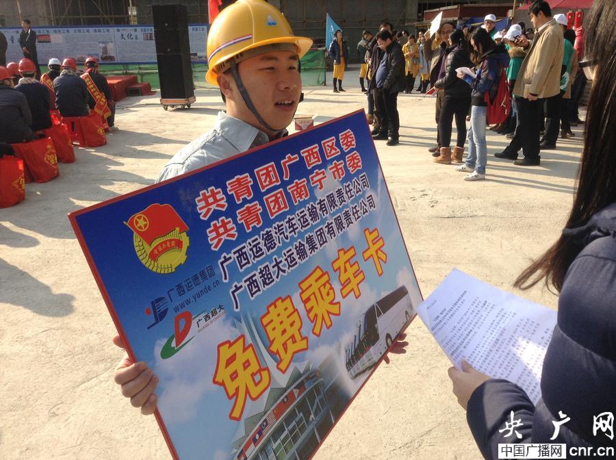 央廣網(wǎng)南寧1月14日消息(記者張壘 許大為 鄧君洋)1月14日上午, “讓溫暖一起回家” 2014年廣西服務萬名外出務工青年春節(jié)返鄉(xiāng)主題系列活動在廣西建工集團項目工地上正式啟動。儀式上,優(yōu)秀外出務工青年獲贈新年大禮包和返鄉(xiāng)車票。